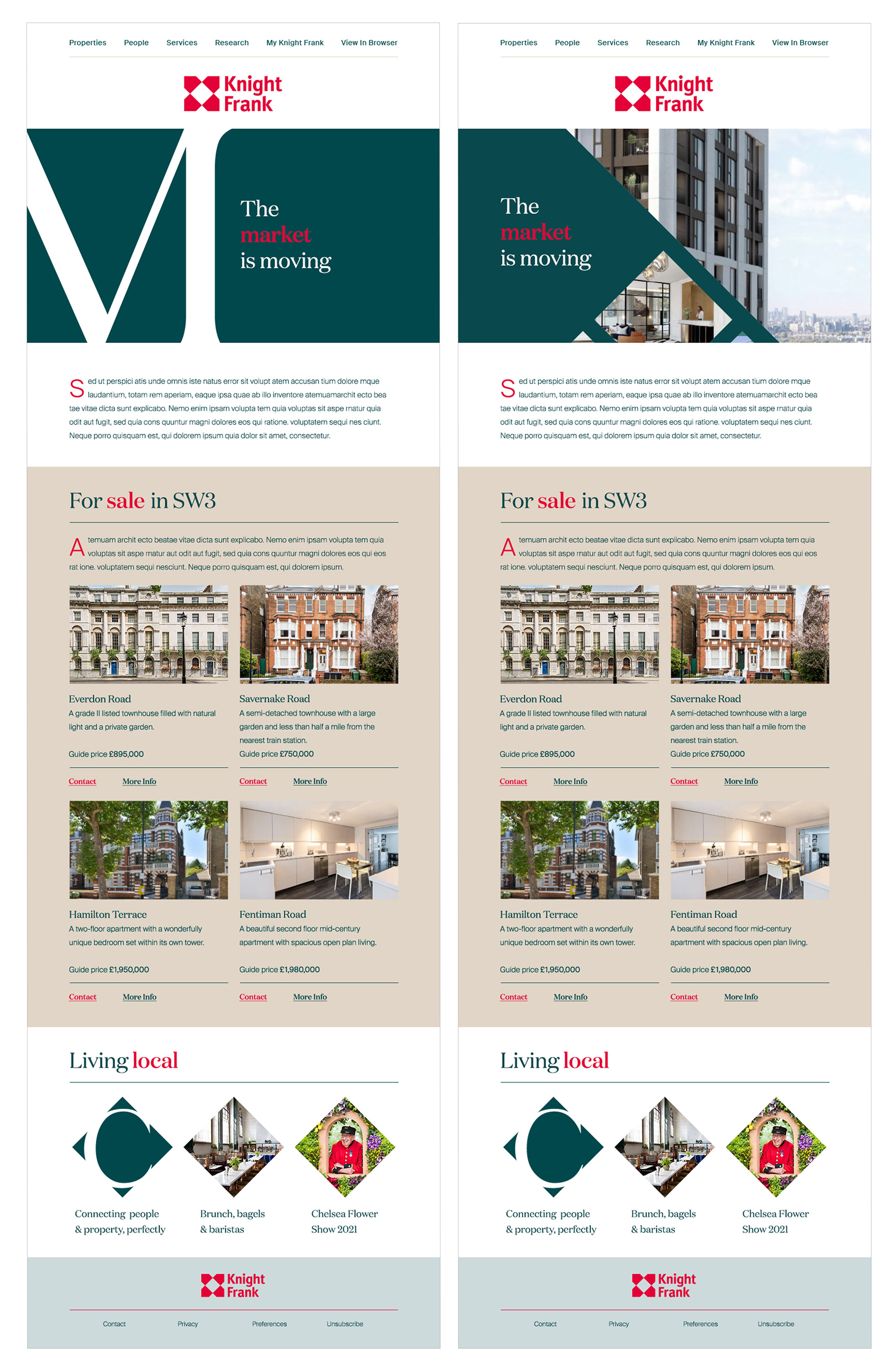 Helping Knight Frank to launch a new brand identity across their UK residential marketing, I developed a new brand look that incorporates typographical design elements within their existing brand colours and fonts. In the new suite of assets, capital letters, beautiful clean typography and a unified colour palette become the centre point. Rolled out across social, digital, email and DM, the assets are a cohesive suite that has enabled the Knight Frank team to have a consistent look and feel across all channels. I have also provided the local teams with a suite of templates they can deploy with ease,